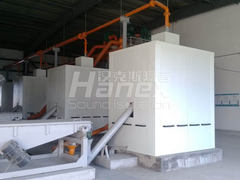 廠區車間內4臺破碎機運行時噪聲量達到120分貝,影響廠區環境和工人工作。漢克斯對每臺破碎機單獨設置隔聲罩后,距離設備一米處測得噪聲值為80分貝,低于國家衛生標準,符合降噪要求。隔聲罩內具有通風散熱照明功能,能夠保證內部設備的正常運行。
