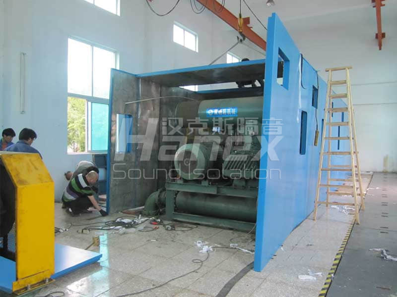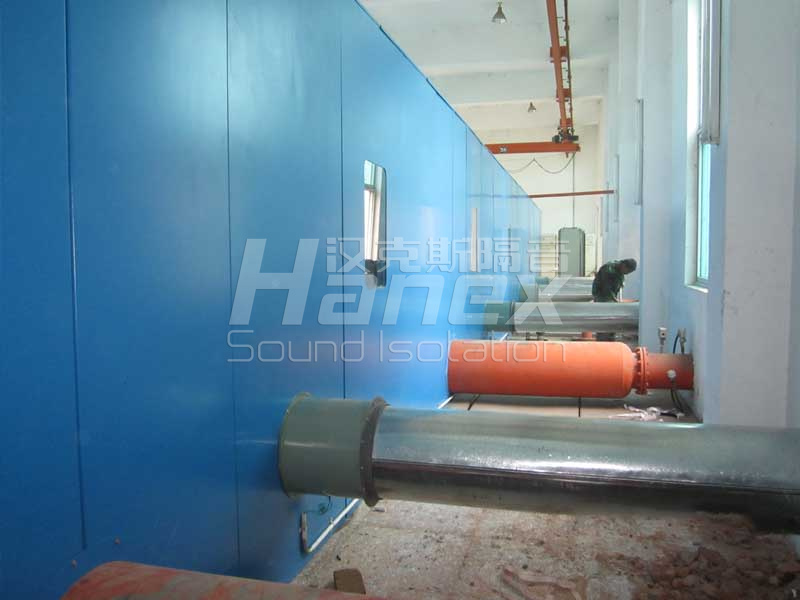 案例簡介:廠內(nèi)有5臺羅茨鼓風(fēng)機,單臺風(fēng)機功率為132Kw,5000m3/hr,運行時噪聲值在105dB(A)以上。治理后,在隔聲罩1米處噪聲值小于85dB(A),達到規(guī)定值。