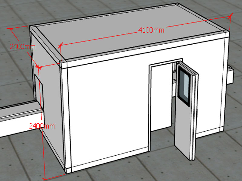 1.1.1根據(jù)我司技術(shù)人員現(xiàn)場測量,流水線處環(huán)境噪聲為75-78dB(A),設(shè)計隔音房尺寸為:2400mm*4100mm*2400mm。隔音房板厚120mm,預(yù)計隔音房安裝完成后,內(nèi)部噪聲值降至40dB(A)。